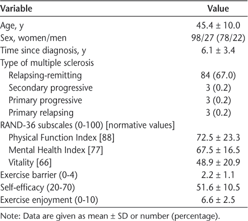 Table 1 shows that the sample had a mean ± SD age of 45.4 ± 10.0 years, was predominantly women (78%), and had a diagnosis of the relapsing-remitting type of MS (67%). Also shown are values on the RAND-36 subscales, including normative values from the Canadian population.30