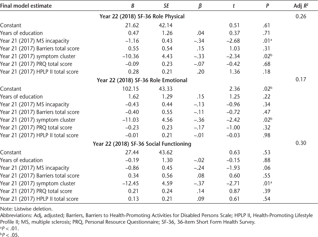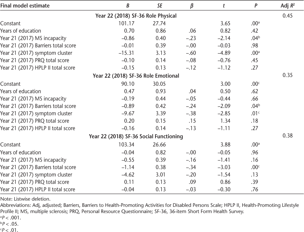 Tables 1 and 2 present the results of the hierarchical multivariate regressions to predict the SF-36 subscale scores separately for the two MS course groups. For physical role limitations measured in 2018, MS incapacity and symptom cluster measured in 2017 were significant predictors for both groups. Incapacity of MS was a stronger predictor for people with progressive MS, whereas symptom cluster was a stronger predictor for those with nonprogressive MS. Symptom cluster added significantly to the prediction of Role Emotional scores for both groups after entering education and ISS scores, and the Barriers total score was an additional significant predictor for people with nonprogressive MS. For the 2018 Social Functioning score, the Barriers total score was the only significant predictor for people with nonprogressive MS, and symptom cluster was the only significant predictor for those with progressive MS. The adjusted R 2 values were all relatively higher (eg, 0.45 vs 0.26) for the nonprogressive group than for the progressive group. Although the Barriers, PRQ, and HPLP II total scores did not emerge as significant predictors for most SF-36 subscales for both groups in the multivariate regressions, they were mostly highly associated in the bivariate correlations. Because of multicollinearity, the shared variance of the Barriers, PRQ, and HPLP II total scores could be explained by other predictors in the same or previous steps in the hierarchical regressions.