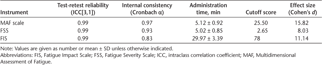 The ICC of all instruments was 0.99. Internal consistency was 0.97 for the MAF scale, 0.93 for FSS, and 0.83 for FIS. The instruments showed moderate-to-good correlations with Pittsburgh Sleep Quality Index, EDSS score, and disease duration. Acceptability was acceptable. The FIS had three dimensions, and the FSS and MAF scale were unidimensional. All scales were able to discriminate patients with MS from controls.