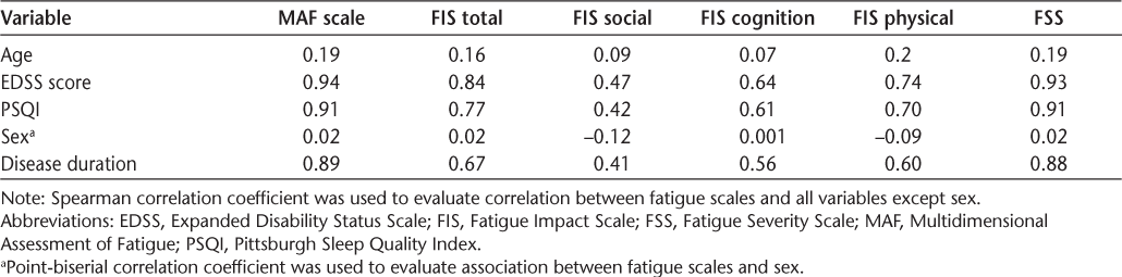 Associations between the fatigue instruments and sex, age, EDSS score, disease duration, and PSQI