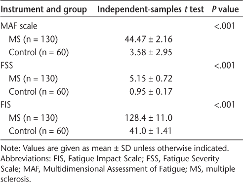 A total of 130 patients with RRMS (87 women, 43 men) and 60 controls (33 women, 27 men) participated in this study. Patients with MS had a mean ± SD age of 33.65 ± 4.18 years. In the MS group, 60 patients were married and 33 were divorced or widowed. The mean ± SD EDSS score was 2.17 ± 1.43 (range, 1–2.5) and disease duration was 7.55 ± 3.2 (range, 4–13) years. The mean ± SD age of the control group was 35.01 ± 5.91 years. In the control group, 31 participants were married and the others were either divorced or widowed. There was no significant difference in age (P = .52) between the groups. Known-group validity was evaluated for all three scales. The Levene test for equality of variances was significant (P < .001) for all instruments, showing that the variances were nonhomogeneous.