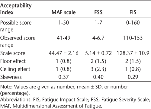 No ceiling or floor effects were observed in the present study. This is in line with the findings of previous studies that reported minimal floor and ceiling effects for the FSS.34,37 The Persian version of the MAF scale was also found to have no floor or ceiling effects.24 Confirmatory factor analysis showed that the Persian versions of the MAF scale and FSS were unidimensional and the Persian FIS was a three-dimensional scale. The unidimensionality of the FSS was previously confirmed in similar studies. To our knowledge, the dimensionality of the MAF scale has not been reported previously in patients with MS. Fairbrother et al47 confirmed the unidimensionality of the MAF scale in a group of pregnant and postpartum women. Wolfe48 found three dimensions for the MAF scale in patients with rheumatoid arthritis. There are disagreements in the literature about the unidimensionality or multidimensionality of the MAF scale. The other limitation was the availability of studies evaluating the MAF scale in populations with MS to be considered for comparison.