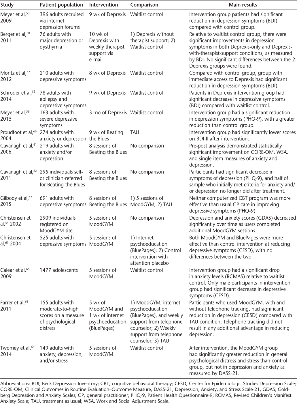 Previous research has shown that the MoodGYM program can effectively treat depression.63 65 66 One of the initial studies of MoodGYM compared its effectiveness in reducing depressive symptoms to an internet psychoeducation website focusing on depression literacy (BluePages).65 Five hundred twenty-five participants were randomly divided into a CBT (MoodGYM) group, a psychoeducation depression literacy (BluePages) group, or a control group in which participants were called weekly to discuss lifestyle and environmental factors influencing depression. Results showed that both MoodGYM and BluePages were more effective than the control intervention at reducing depressive symptoms (based on Center for Epidemiologic Studies Depression Scale scores), with no difference between the two interventions. MoodGYM participants completed half of the 29 exercises assigned, and there was a 25% dropout rate in this group, whereas there was a 15% dropout rate in the BluePages group. Follow-up 6 months after treatment indicated that the reduction in depressive symptoms remained significant in the CBT group only, whereas at 12 months both the CBT and depression literacy groups had significantly reduced depression symptoms compared with the control group.67 Later work by Farrer et al63 assessed whether adding weekly telephone tracking to the intervention could improve effectiveness and found that telephone tracking did not result in any additional advantage in reducing depressive symptoms or increasing adherence.