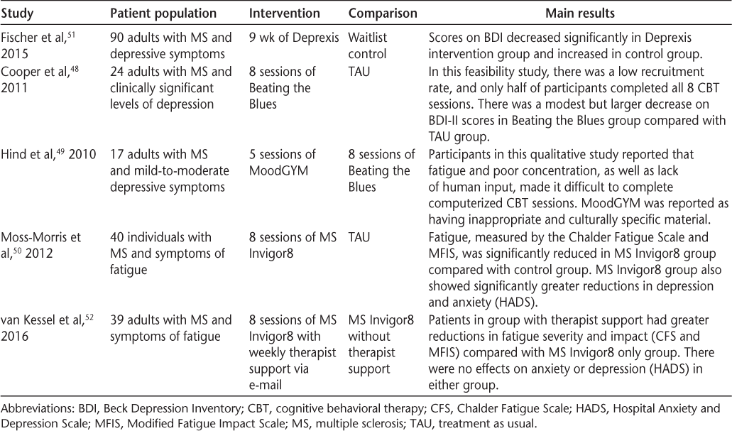 Although recruitment of patients with MS for computerized CBT trials can be challenging,48 several trials of computerized CBT programs have been completed in MS (Table 2).48–52 Some of these trials have shown promising results, such as reductions in depressive symptoms,50 51 but these programs need to be optimized to meet the needs of patients with MS. In various trials, some of the main patient-reported drawbacks were that 1) the tool was not personalized enough to meet individualized needs of patients with MS and 2) the programs offered limited explanation of the relationship between chronic disease/MS and depression.49 51 There are a variety of programs available to patients with MS for computerized CBT, and to date, none has proved more effective than another. In the following section we review the treatment effects of four computerized CBT programs that have been previously tested in patients with MS: Deprexis,53 MoodGYM,54 Beating the Blues,55 and MS Invigor8.50