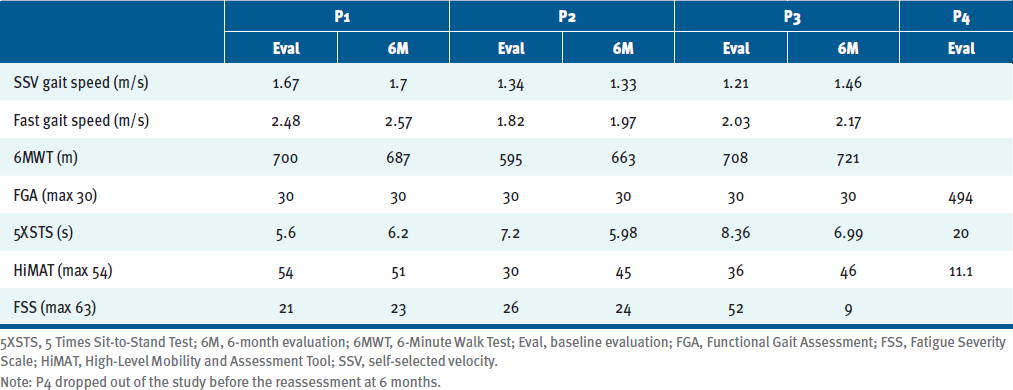 Patients signed an informed consent and Health Insurance Portability and Accountability Act privacy document before participation in the case series. Patients attended a 90-minute evaluation, including a full clinical evaluation and an individually tailored goal setting and exercise prescription.23 At the evaluation, functional strength was measured with the 5 Times Sit-to-Stand Test (5xSTS),24 the 10-Meter Walk Test (10MWT), and a self-selected velocity (SSV) and a fast velocity (FV) test; functional exercise capacity was measured by the 6-Minute Walk Test (6MWT)25; dynamic balance was measured with the Functional Gait Assessment (FGA)26; higher level mobility was measured with the High-Level Mobility Assessment Tool (HiMAT)27; and self-reported fatigue was measured with the Fatigue Severity Scale (FSS).28
