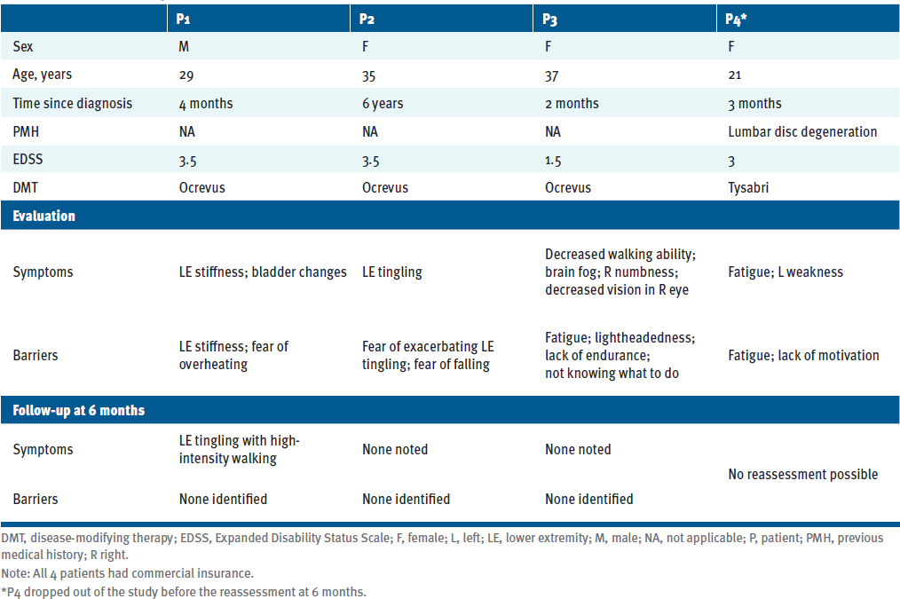 Four patients (P1, P2, P3, P4) were referred to PAPT, 3 by their neurologist during a standard clinic appointment and 1 by their neurologist for restorative PT. This patient completed restorative PT 2 times per week for 4 weeks and then transitioned to the PAPT model of care due to their recent diagnosis of MS, functional status, and exercise goals. All 4 patients were on disease-modifying therapy and had initial Expanded Disability Status Scale scores of 3.5 or less. TABLE 1 includes patient background information, reported MS symptoms, and reported barriers to exercise.