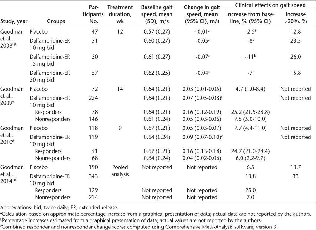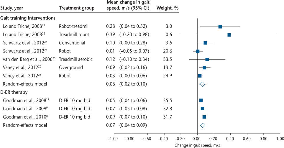Results: Treatment effects on gait speed were extracted from four studies examining the efficacy of dalfampridine and six gait training RCTs. Overall mean increase in gait speed with dalfampridine was 0.07 m/s (95% confidence interval [CI], 0.04–0.09 m/s) compared to 0.06 m/s (95% CI, 0.02–0.10 m/s) for gait training. Among dalfampridine responders (38% of participants in RCTs), the mean increase in gait speed was 0.16 m/s (95% CI, 0.13–0.18 m/s). Mean increases for individual gait training interventions ranged from 0.01 to 0.39 m/s; however, CIs were wide due to small sample sizes.
