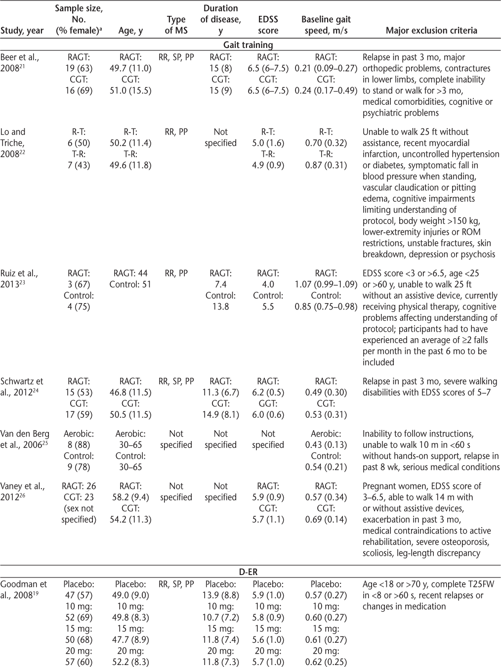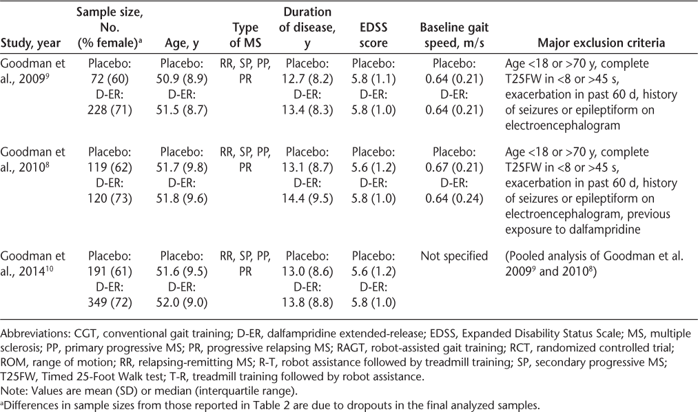 Participant characteristics and major exclusion criteria for each of the studies are summarized in Table 3. Across all of the studies, the participants were predominantly women, with a mean or median age in the late 40s or early 50s. All of the studies excluded participants with recent relapses. The cognitive function of the participants was largely unreported. Mean or median disease duration was relatively consistent (typically, 11–15 years) across studies but was not always specified in the gait training studies. Despite similar demographic characteristics, direct comparisons of treatment effects between the gait training studies and the dalfampridine-ER trials should be made with caution because the studies differed in terms of average baseline gait speed and level of disability (Table 3). The dalfampridine trials had considerably larger sample sizes and longer treatment periods than any of the gait training trials. Indeed, several of the gait training trials were reported as pilot studies, with very small sample sizes and insufficient statistical power. Thus, the effect sizes observed for the gait training studies should be viewed cautiously. Of the six gait training RCTs, only Lo and Triche22 reported an effect size greater than the average 0.16 m/s increase in gait speed observed for dalfampridine responders.8 9 However, most of the gait training interventions, regardless of modality, produced larger mean increases in gait speed than did dalfampridine-ER in the dalfampridine nonresponders. Given that 62% of people who receive dalfampridine-ER are nonresponders,10 there is a tremendous need for development of other interventions for gait rehabilitation for people with MS.