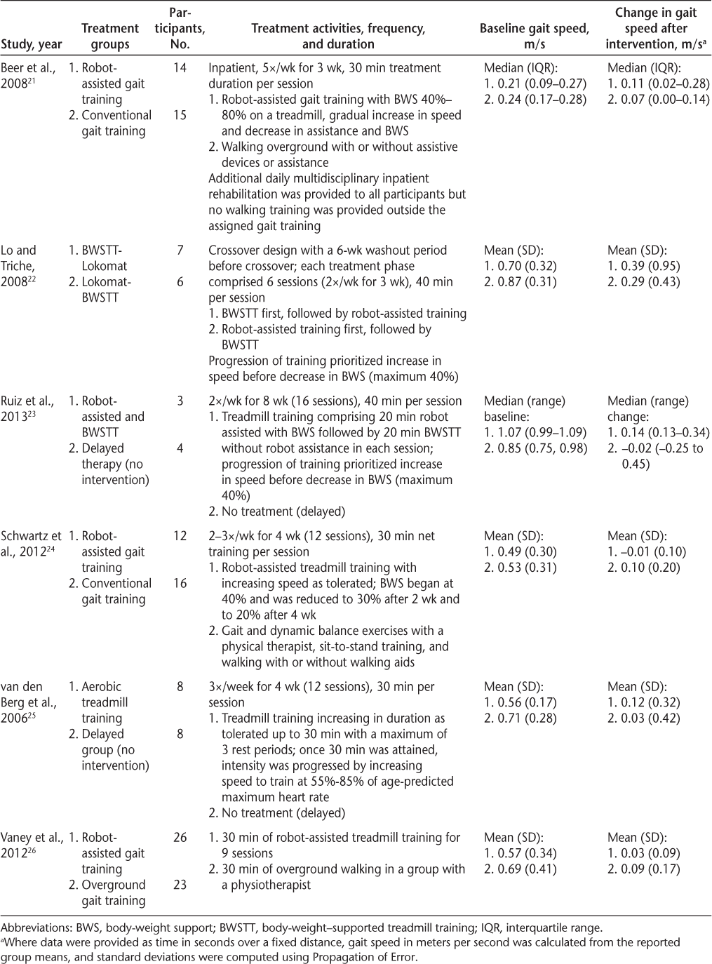 The most recent RCT,23 which was not included in the systematic review by Swinnen et al.,51 compared a combination of robot-assisted gait training and body-weight–supported treadmill training (without robot assistance) for 16 sessions over 2 months with a no-treatment control. The sample size was very small (N = 7), and although the median change in gait speed in the gait training group (0.14 m/s) was greater than that in the no-intervention control group (−0.02 m/s), the difference was not statistically significant.