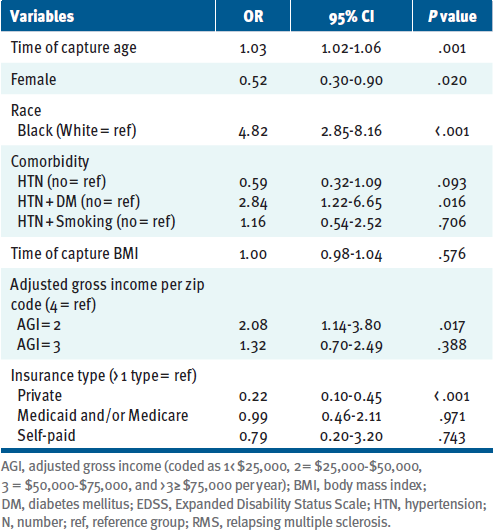 We assessed the social determinants of health (SDOH) by looking at the insurance type and the zip code adjusted gross income (AGI). The AGI was determined using the zip codes from patients’ charts at the time of data capture and calculated from the 2019 Internal Revenue Service data (publicly available at irs.gov/statistics/soi-tax-stats-individual-income-tax-statistics-zip-code-data-soi). This was coded as 1 for an AGI less than $25,000, 2 for an AGI between $25,000 and $50,000, 3 for an AGI between $50,000 and $75,000, and > 3 for an AGI more than $75,000. We performed statistical analysis utilizing SPSS (29.0.0.0). Descriptive analyses were conducted by using a χ2 test for categorical variables (eg, sex, MS type) and independent samples t test for continuous variables (eg, age, number of relapses). Multiple logistic regression analyses were used to determine the associations between EDSS and odds of requiring ambulatory assistance with race and by controlling for age at disease onset, age at time of capture, sex, comorbidities, MS phenotype, AGI, and insurance status. Statistical (eg, χ2 test) and logical measures were used to avoid multicollinearity.