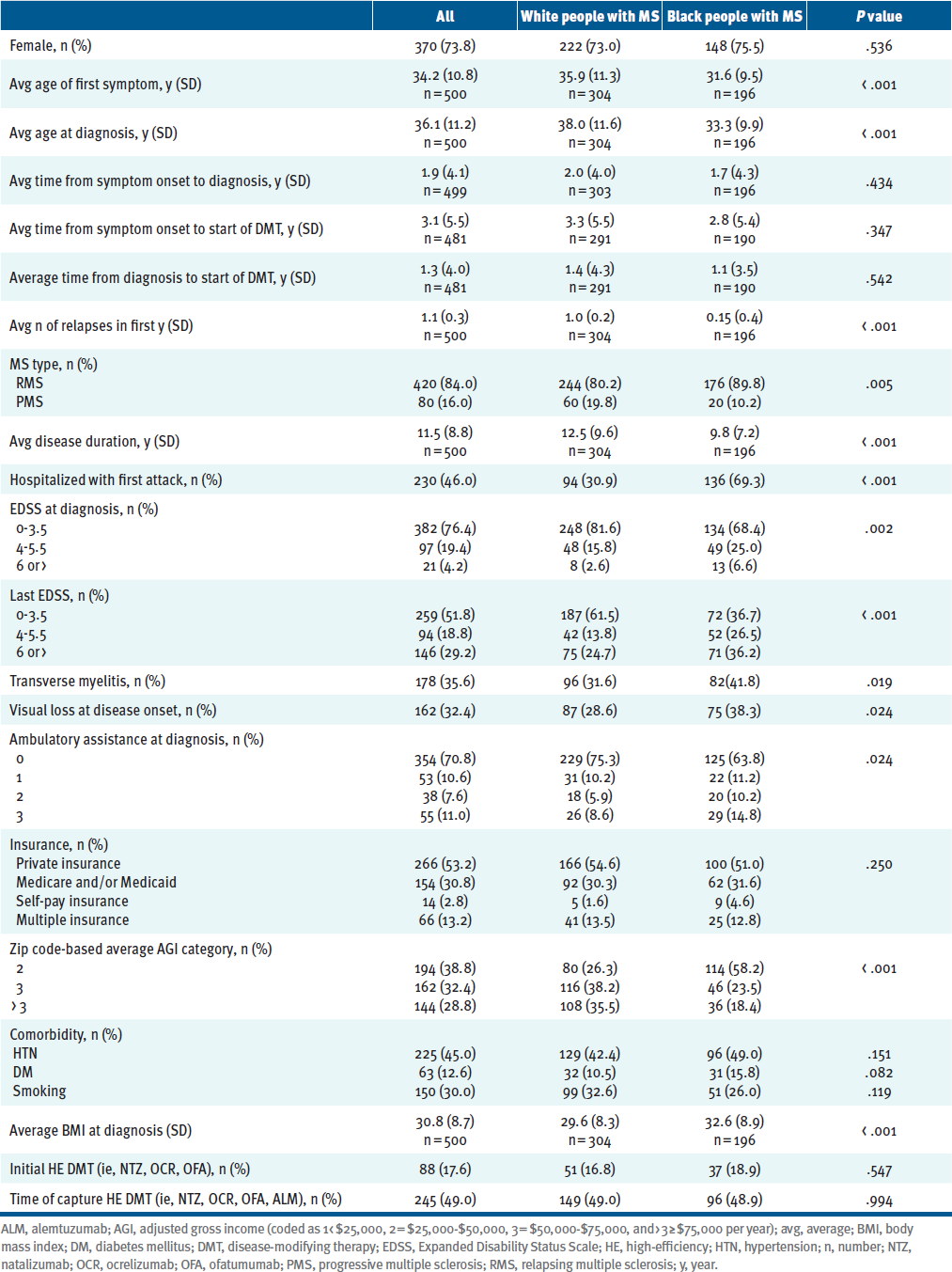 Out of the 500 patients in this study, 60.8% identified as White, and 39.2% identified as Black. TABLE S1 contains a summary of the clinical and socioeconomic characteristics of each group. At the time of the study, there was no significant difference in the average age at data acquisition between the 2 populations; the average for White people with MS was 47 years old and the average for Black people with MS was 49 years old (P = .081). Black people with MS were younger at disease onset than White people with MS, with the first symptom for Black people with MS occurring at 32 years of age vs 36 years of age in the White people with MS group (P < .001). The average age of diagnosis was 33 years old for Black people with MS and 38 years old for White people with MS (P < .001). Whereas 90% of Black people with MS had relapsing MS (RMS), only 80% of White people with MS had a relapsing form of MS (P = .001). The average duration of disease for these patients with RMS was 9.8 years for Black people with MS and 12.5 years for White people with MS. The average duration of follow-up from diagnosis to most recent clinic appointment was 116 months for Black people with MS and 149 months for White people with MS. There was not a statistically significant difference in time from symptom onset to diagnosis between Black people with MS and White people with MS, with both averaging close to 2 years. The time to initiate disease-modifying therapy calculated from both symptom onset and time of diagnosis was no different among the groups (Table S1).