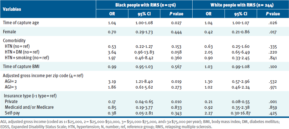 Of the cohort, 39.2% identified as Black people with MS and the rest were White people with MS. Approximately 80% of White people with MS had relapsing MS (RMS) vs almost 90% of Black people with MS. Black people with MS were more likely to have a higher EDSS (OR 5.0, CI 3.0-8.4) and AMB (OR, 2.8; 95% CI, 1.6-4.8) than White people with MS. Among White people with MS, women (OR, 0.5; 95% CI, 0.3-0.9) and people with RMS (OR, 0.13; 95% CI 0.06-0.3) were less likely to have higher EDSS scores. Among Black people with MS, neither female sex nor RMS status was associated with a lower risk of having a higher EDSS (OR, 0.685; P = .43 and OR, 0.394; P = .29, respectively).