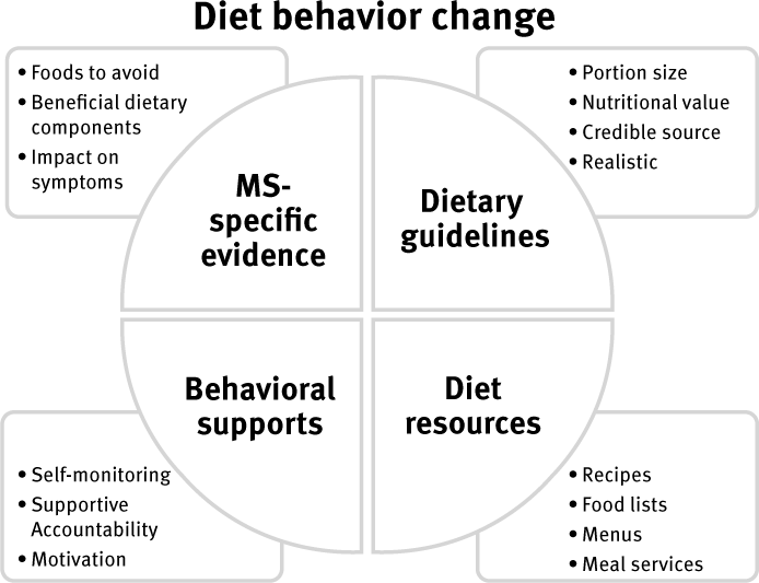 » Behavioral interventions for supporting dietary change in MS can include behavioral supports and resources such as recipes, menus, and food lists to help support well-being in persons with MS.