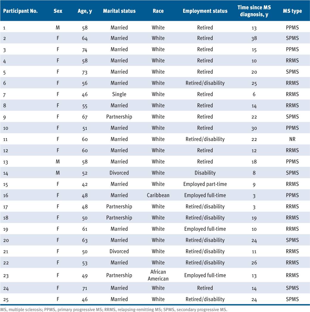 Of the 26 individuals who expressed interest, 25 were screened for the inclusion criteria and provided informed consent. Participant characteristics are provided in TABLE 1. The mean (SD) participant age was 56.5 (8.7) years (range, 42–74 years), and most participants were female (n = 23) and self-identified as White (n = 24). Participants had a mean (SD) disease duration of 16.4 (8.6) years (range, 3–38 years). Twelve participants reported a diagnosis of relapsing-remitting MS and 12 participants reported a diagnosis of progressive MS (5 primary and 7 secondary); 1 participant did not report a clinical course.