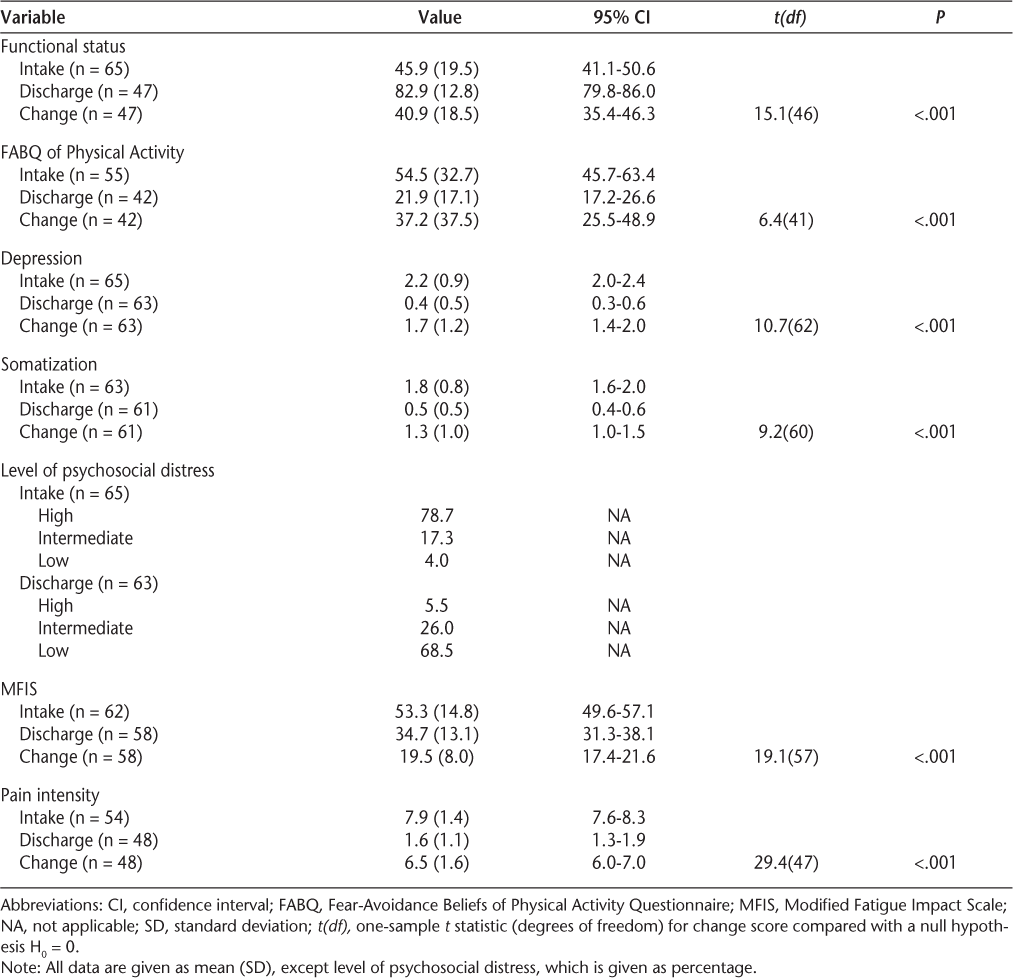 The patients received 12 visits over 12 weeks. Descriptive statistics for all construct measures and change analyses are displayed in Table 2. Although we consider these to be pilot data and the sample size to be small, the results are positive. For example, considering the 95% confidence intervals and Cohen's d statistics, intake-to-discharge comparisons were significant (P < .05) for functional status (d = 2.72; 95% CI, −0.94–7.78), fear-avoidance beliefs of physical activities (d = 1.62; 95% CI, −7.34–6.79), depression (d = 2.35; 95% CI, 2.13–2.48), somatization (d = 1.81; 95% CI, 1.61–1.94), fatigue (d = 1.39; 95% CI, −2.27–4.76), and pain intensity (d = 4.53; 95% CI, 4.11–4.84). Change score t-statistic analyses supported the descriptive statistics. In addition, patients who reported reduced risk of psychological distress from intake to discharge reported higher discharge functional status (adjusted least squares mean 83.8, SE 2.1) compared with patients whose risk of psychological distress did not decrease (adjusted least squares mean 72.4, SE 4.0) (P = .017).