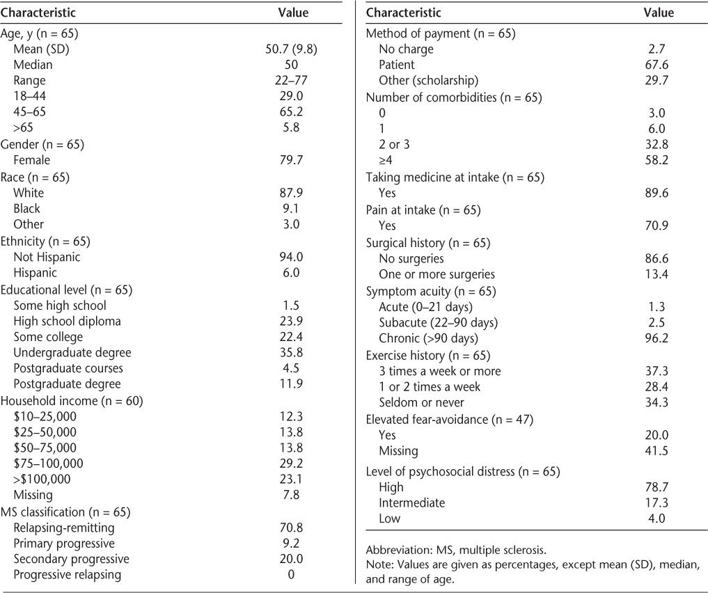 The participants in this study were 65 adult men and women with a mean age of 50.7 years (SD 9.8, median 50, range 22–77) (Table 1). These people were selected for analysis because they had participated in the wellness program and had entered data into the Focus On Therapeutic Outcomes, Inc (Knoxville, TN) outcomes computerized database, which CentraState Healthcare System (Freehold, NJ) used as their outcomes software. All had a diagnosis of MS, which was the only inclusion criterion. All participants either were referred to the program by their physician or referred themselves because they heard about the program from local advertisements or through community contact, such as through a local National Multiple Sclerosis Society chapter meeting. Most of the patients paid for the program with private funds. The clinical pattern of the course of MS for each patient was classified using standardized definitions described by Lublin and Reingold.22 In this sample, the majority of people were classified as relapsing-remitting (71%) or secondary progressive (20%). Most (96%) had had MS for more than 3 months, and all had an interest in learning more about their disease and how to better manage its effects. The majority of patients who volunteered for the wellness program were independent community-dwelling adults. One patient required a caregiver at home, and six patients used a scooter or wheelchair to improve mobility when outside the home.