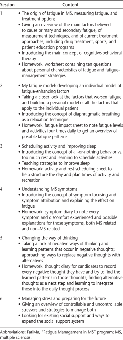 The “Fatigue Management in MS” program (FatiMa) was developed based on an existing CBT manual obtained from Van Kessel et al.18 and on results from the patient interviews and the focus group. Findings from the interviews/focus group that concerned time issues (ie, travel, session length, and homework) were considered, and the program was shaped accordingly. We added information on evidence concerning MS-related fatigue and findings from a recently performed meta-analysis on fatigue-management interventions (MJ Wendebourg, C Heesen, J Poettgen, S Köpke, unpublished data). The FatiMa includes six highly structured and documented modules based on Microsoft PowerPoint (Microsoft Corp, Redmond, WA) presentations. To enhance interaction with and learning from peers, FatiMa is presented in small-group sessions of six to eight patients. The facilitator uses printed cards that give instructions as to what the facilitator should say and do at different points of the session to ensure standardization of the conduct of the program. The key content includes information about causes of fatigue and treatment evidence, sleep, activity and rest, symptom management, stress, and managing thoughts and behavior. A fundamental component of FatiMa is working with examples and transferring knowledge to enhance self-reflection abilities. In each session, participants are asked to freely engage in conversations. Each session begins with a recapitulation of the previous session to clarify possible questions, followed by a discussion of the homework. All the sessions are facilitated by a health-care professional, who can be an MS-specialized nurse or an occupational therapist. Based on previous education programs with trained trainers, we are confident that different health-care professionals can conduct the program.24 25