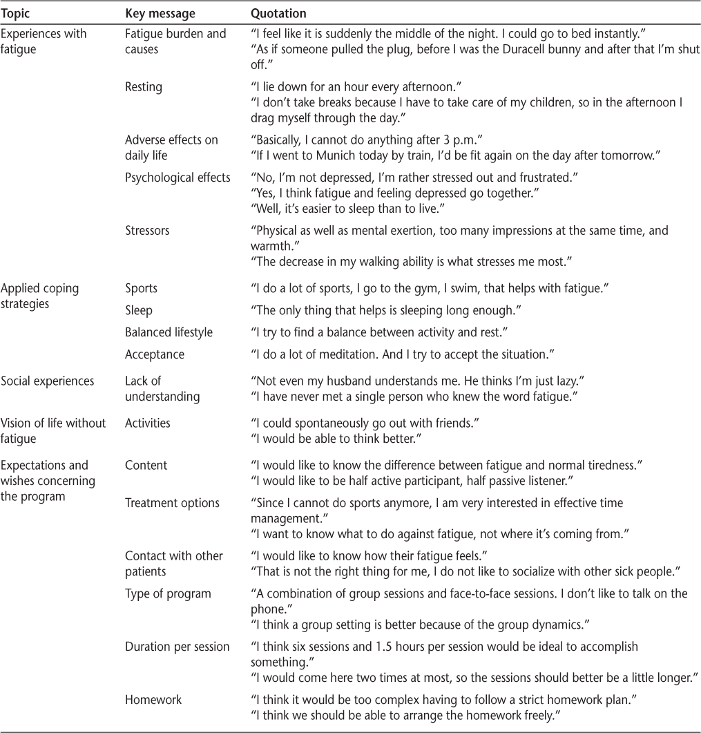 In addition to the interviews, a focus group (n = 12, same inclusion criteria) addressed the same questions as the interviews. Focus group participants had not previously taken part in the patient interviews. We chose a roundtable setting for the group discussion that invited participants to feel relaxed and to facilitate the expression of ideas and thoughts. The discussion was audio-recorded and transcribed. We used framework analysis methods according to Mayring23 to categorize all the collected data systematically. The qualitative content analysis was primarily inductive. Theoretical and practical interpretations of the findings were developed, and a summary table was compiled. One researcher (MJW) transcribed and categorized the statements. This list was then discussed by two of us (SL and JP) based on our views of the transcripts. The transcripts were double-checked, and negotiations of conflicts were discussed with the senior author (CH). The same inclusion criteria and procedures were applied for the focus group as for the interviews. The major aim of the qualitative work was to clarify the relevance of concepts drawn from the literature as well as provide input for offering fatigue-management approaches in a group setting.