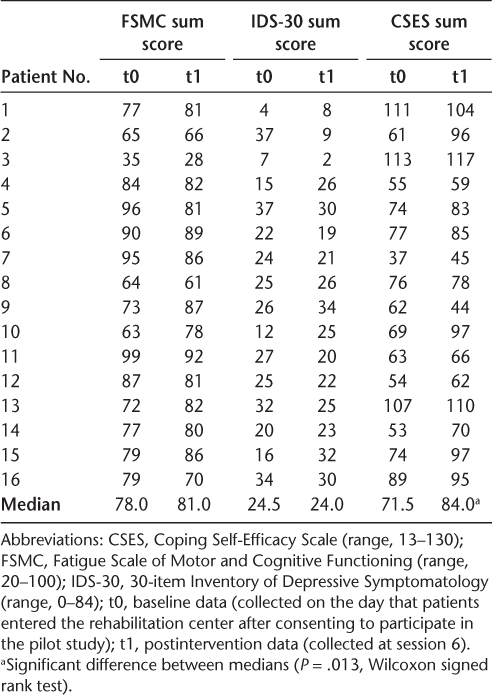The baseline Coping Self-Efficacy Scale median score was 71.50, and the postintervention median score was 84.00, indicating a significant improvement in coping (P = .013). All but one patient showed improved coping self-efficacy.