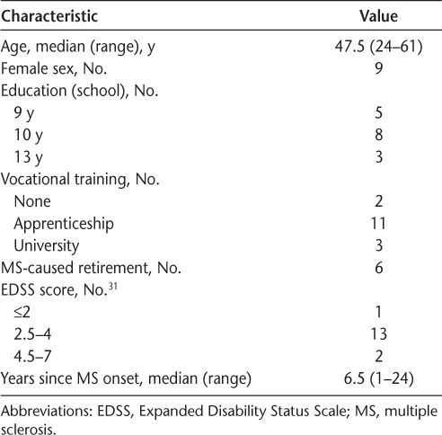 Between January and May 2013, 16 patients from an MS inpatient and outpatient rehabilitation center in Hamburg who had not previously taken part in the focus group participated in the pilot study. Participants were recruited by the rehabilitation center staff. Overall, patients participated in one of three FatiMa pilot trainings, with five to six patients per training. See Table 3 for pilot study patient characteristics. The training was conducted by a specially trained final-year medical student (MJW).