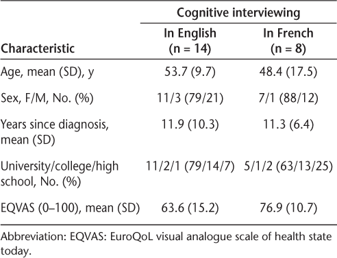 Once the items were reviewed and finalized among the experts, they were then taken to the patients for cognitive interviewing. Table 2 presents the demographic and clinical characteristics of the patients who participated in the cognitive interview. There were 14 and 8 participants who underwent cognitive interviewing in English and in French, respectively. The English cognitive interview participants, compared with the French cognitive interview participants, were slightly older and consisted of a greater proportion of men. However, the mean number of years since diagnosis was the same for both groups (11 years).
