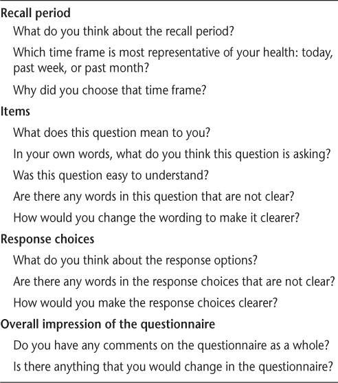 Furthermore, the method we used to conduct the cognitive interviews, verbal probing, is a well-established and accepted method.13 The use of probing helps guide the respondent and shapes the interchange in a way that is controlled mainly by the interviewer. The advantages of this method are that it helps avoid irrelevant or unnecessary discussion during the interview and helps the interviewer concentrate on areas that seem to be important sources of error.11 13 The alternative method, which is the think-aloud method, also has its own advantages. For example, minimal interviewer training is required because the interviewer is required to mainly listen to the respondent talk. Furthermore, because minimal guidance is provided, the respondent or patient may provide information that is unanticipated by the interviewer. However, the disadvantage of the think-aloud method is that all the respondents may not be outgoing and elaborate very much on a question. Also, this method places a significant amount of burden on the respondent and may result in the individual wandering off track and delving into unrelated topics.11 13