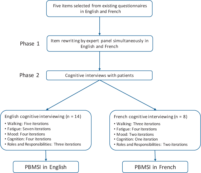 The items selected for inclusion in the PBMSI had different phrasing styles and recall periods. Owing to these variations, the items needed to be rewritten for uniformity and coherence. As presented in Figure 1, item revision was conducted in two phases. The first phase involved item revision and rewriting by experts simultaneously in English and French. In the second phase, the items were cognitively debriefed with 22 patients with MS, 14 in English and 8 in French. During the cognitive interview process, each item went through several iterations before being accepted as the final version included in the PBMSI.