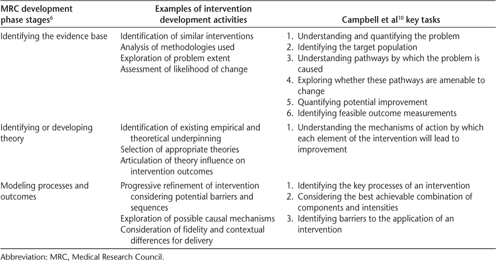 The MRC framework6 development phase comprises three stages: 1) identifying the evidence base, 2) identifying/developing theory, and 3) modeling processes and outcomes. Campbell et al10 identified a variety of key tasks in each stage (Table 1) that will be used to structure the reporting of the development of Better Balance.
