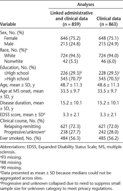 This analysis included 863 participants enrolled at MS clinics in British Columbia, Manitoba, and Nova Scotia.13 Clinical data for these participants were linked with their provincial administrative data. In each province, we obtained ethics approval, participant consent, and approval to access administrative data.