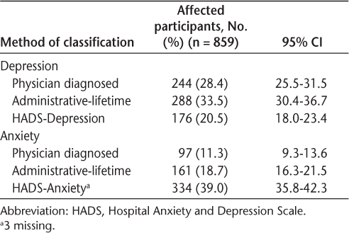 The estimated lifetime prevalence of depression was approximately 30%, regardless of whether we used administrative data or patient reports of physician diagnoses as the ascertainment method, whereas we found a prevalence of 21% when using a screening tool for current symptoms of depression. In contrast, the lifetime prevalence estimates of anxiety ranged from 11% to 19%, but the prevalence was higher (39%) when the screening tool for current symptoms was used and exceeded that for depression.