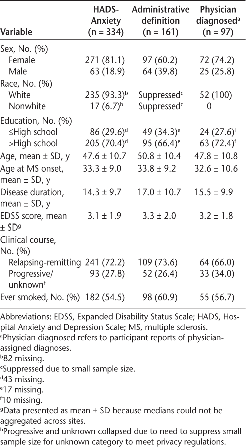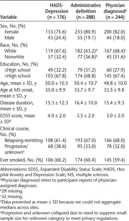 Depression and anxiety are common in multiple sclerosis (MS), and they occur more often in the MS population than in the general population.1 Depression and anxiety are associated with increased health care utilization in MS2 and other adverse outcomes.3–5 Studies assessing the prevalence of depression and anxiety in MS have used various ascertainment methods,1 including medical records review, interviews, self-reports of physician diagnoses, symptom-based questionnaires, and administrative data. Although each approach is valid in its own right, each captures different constructs and can lead to widely varying prevalence estimates for depression and anxiety.1 Medical records and administrative data capture conditions for which care was sought and a diagnosis recorded, or for which a provider recorded a diagnostic code while caring for another condition; therefore, they estimate “medically recognized prevalence.”6 Structured diagnostic interviews capture conditions for which the individual may or may not have sought care. Self-report instruments assess current symptoms of depression or anxiety and require diagnostic confirmation.7 A better understanding of the relationships between such ascertainment methods and how the populations classified as affected by these methods differ is needed to support surveillance efforts for psychiatric comorbidity in MS.
