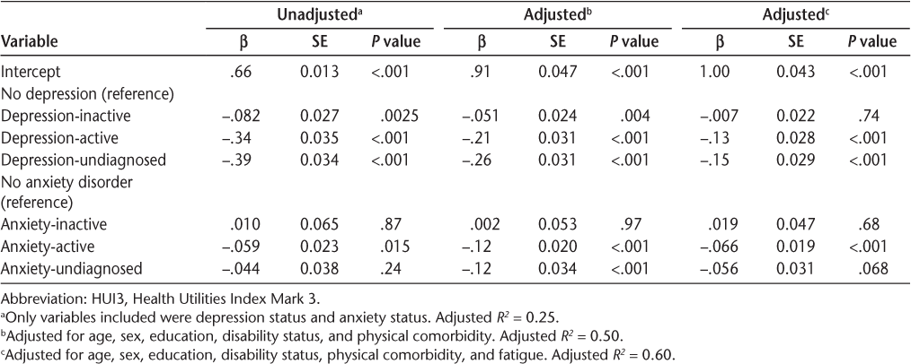 On multivariable analysis adjusting for age, sex, education, disability status, and physical comorbidity, all categories of depression were associated with reduced HRQOL, but inactive depression had a small effect (Table 5) (model-adjusted R 2 = 0.50). Inactive anxiety was not associated with reduced HRQOL. Undiagnosed anxiety reduced HRQOL to the same degree as active, diagnosed anxiety. With additional adjustment for fatigue, inactive depression was no longer associated with reduced HRQOL. Although the effects of active depression and undiagnosed depression were reduced compared with the previous model, the magnitude of the effects exerted by each condition remained similar to each other. Findings for anxiety were essentially unchanged.