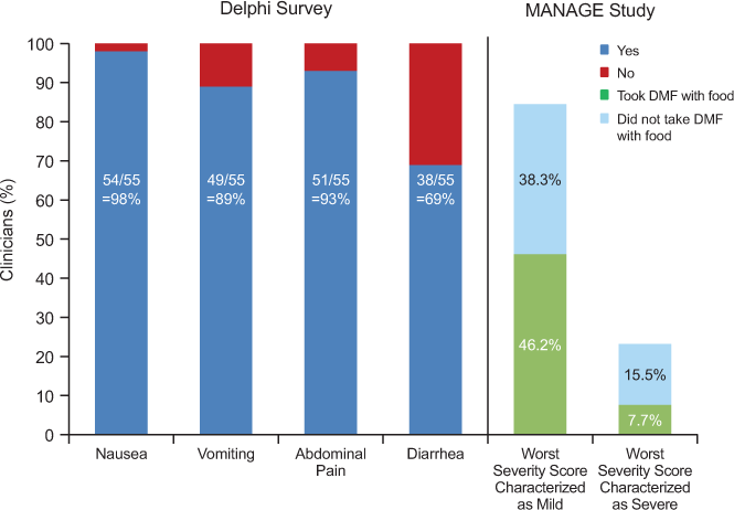 Percentage of clinicians who agree with the use of food as a management strategy to reduce the incidence and severity of delayed-release dimethyl fumarate (DMF; also known as gastroresistant DMF)–associated nausea, vomiting, abdominal pain, and diarrhea (Delphi survey; yes/no, consensus ≥70%)20
