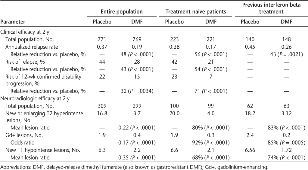 Prespecified integrated analyses of the randomized double-blind DEFINE8 and CONFIRM7 studies revealed that at 2 years, DMF 240 mg twice a day significantly reduced the annualized relapse rate and risk of relapse and improved a range of secondary clinical, magnetic resonance imaging, and patient-reported outcomes versus placebo (Table 1).11,12 Importantly, these benefits of DMF therapy were observed consistently across patient subgroups, including treatment-naive patients and switchers from interferon beta therapy (Table 1).11,13,14 The clinical and magnetic resonance imaging efficacy of DMF was maintained over 5 years in the ENDORSE (A Dose-Blind, Multicenter, Extension Study to Determine the Long-Term Safety and Efficacy of Two Doses of BG00012 Monotherapy in Subjects with Relapsing-Remitting Multiple Sclerosis) study, an ongoing, 8-year extension study of DEFINE and CONFIRM.15