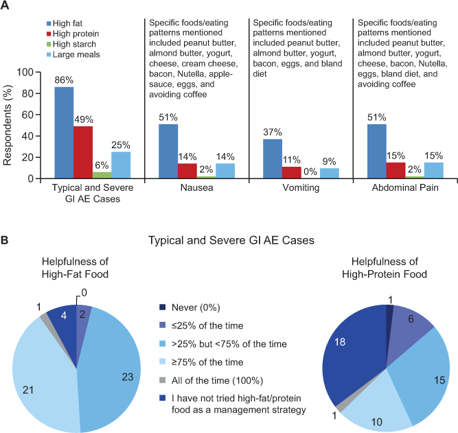Food types most frequently recommended as a management strategy or observed as having an effect in managing individual adverse events (AEs) (A) or reported to be helpful for preventing individual AEs (B)20