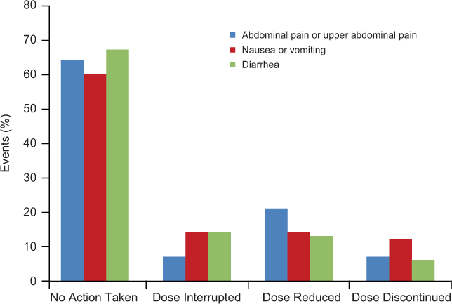 Table 2 summarizes the range of medicines considered highly useful for managing GI AEs in a consensus-building survey20 and in MANAGE.9 In MANAGE, immediate and pronounced reductions in the severity of GI AEs were evident with the use of bismuth subsalicylate, acid-secretion blockers, and antidiarrheal agents.9 Ondansetron, promethazine, and bismuth subsalicylate have shown utility for managing both nausea and vomiting, as has the use of antacids for nausea.9,20 Abdominal pain can be managed with bismuth subsalicylate, antacids, and antisecretory drug treatment, and diarrhea can be managed with loperamide and diphenoxylate/atropine.9,20