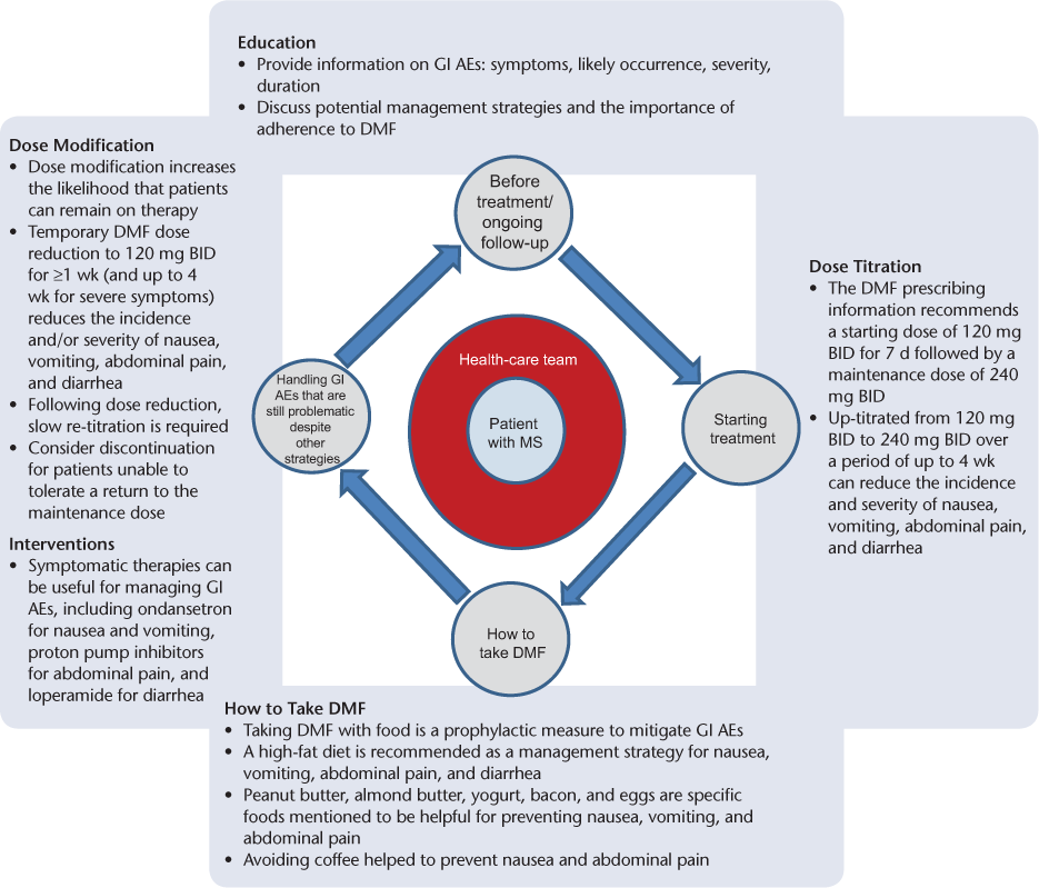 Results: Before starting DMF therapy, patients should receive counseling on the importance of treatment adherence and the likely occurrence and severity of flushing and GI AEs (nausea, vomiting, diarrhea, and abdominal pain). Management strategies, such as administering DMF with food, using a slower-dose titration schedule, applying temporary dose reductions, and using symptomatic therapies, provide clinicians with several approaches to address DMF tolerability. In particular, DMF coadministration with certain foods (eg, sausage, peanut butter) may prevent or reduce the severity of GI AEs. Taking aspirin 325 mg/day 30 minutes before administering DMF in the first month of therapy can reduce the incidence and severity of flushing without negatively affecting GI-related events.
