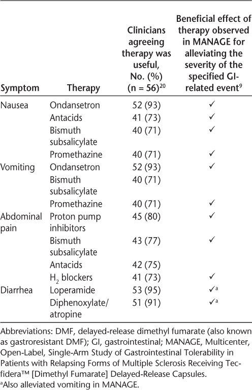Phillips JT, Erwin AA, Agrella S, et al. Consensus management of gastrointestinal events associated with delayed-release dimethyl fumarate: a Delphi study. Neurol Ther. 2015; 4:137–146.