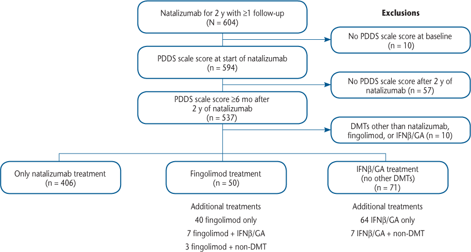 Participants were excluded from these analyses if they did not report PDDS scale scores in the first survey indicating natalizumab treatment (baseline) or did not have at least one report of PDDS scale scores 6 months or more after the qualifying 2 years of natalizumab treatment. Participants who switched from natalizumab therapy to DMTs other than fingolimod, IFNβ, or GA were also excluded.