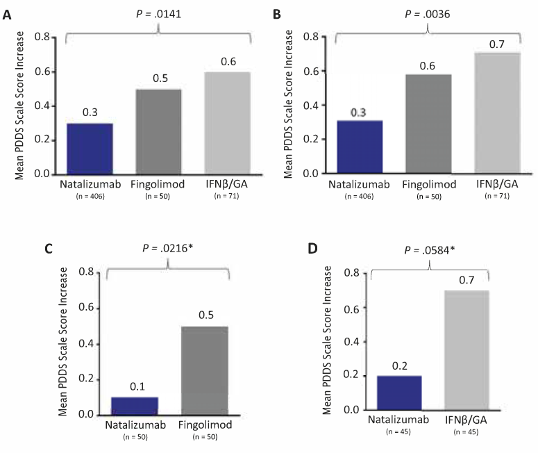 Mean Patient-Determined Disease Steps (PDDS) scale score increases determined by unadjusted (A), covariate-adjusted (B), natalizumab-fingolimod propensity score–matched (C), and natalizumab–interferon beta (IFNβ)/glatiramer acetate (GA) propensity score–matched (D) analyses