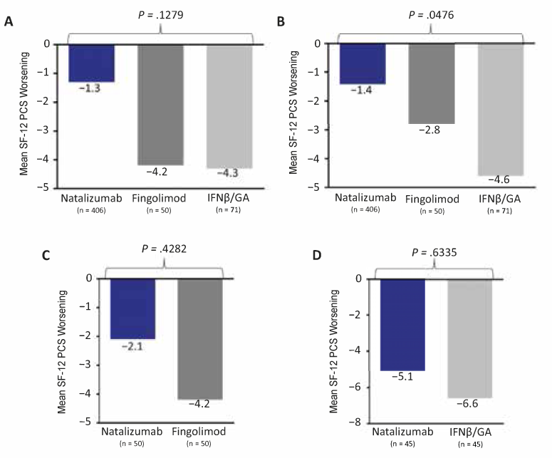 Mean 12-item Short Form Health Status Survey Physical Component Score (SF-12 PCS) worsening determined by unadjusted (A), covariate-adjusted (B), natalizumab-fingolimod propensity score–matched (C), and natalizumab–interferon beta (IFNβ)/glatiramer acetate (GA) propensity score–matched (D) analyses