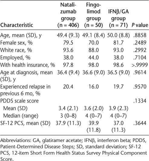 Comparisons of baseline characteristics between treatment groups were made by the Wilcoxon test for continuous variables and by the χ2 test for categorical variables. The proportion of participants in each treatment group with increased PDDS scale scores was compared using the likelihood ratio test or the Fisher exact test. Mean changes in PDDS scale scores and SF-12 PCSs were compared using analysis of variance. Median total follow-up time was compared by the Wilcoxon test. Because participation in the NARCOMS Registry is voluntary and participants are not randomized to treatments, logistic models and propensity score matching were performed separately to avoid potential covariate imbalances that might confound interpretation of any potential treatment group differences. Bonferroni correction was used to adjust for multiple comparisons.