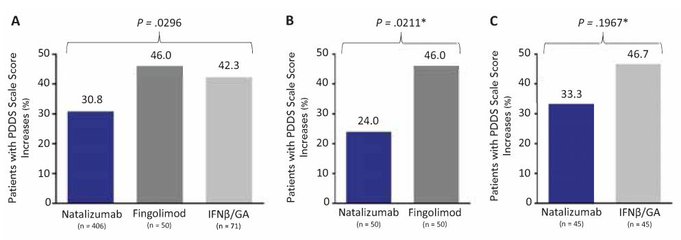Results: Participants continuing to take natalizumab had less disability progression (mean PDDS change: natalizumab, 0.3; fingolimod, 0.6; IFNβ/GA, 0.7; P = .0036), were less likely to report disability progression (proportion with PDDS increase: natalizumab, 31%; fingolimod, 46%; IFNβ/GA, 42%; P = .0296), and had less worsening in physical HRQOL (mean SF-12 PCS change: natalizumab, −1.4; fingolimod, −2.8; IFNβ/GA, −4.6; P = .0476) than those switching treatment.