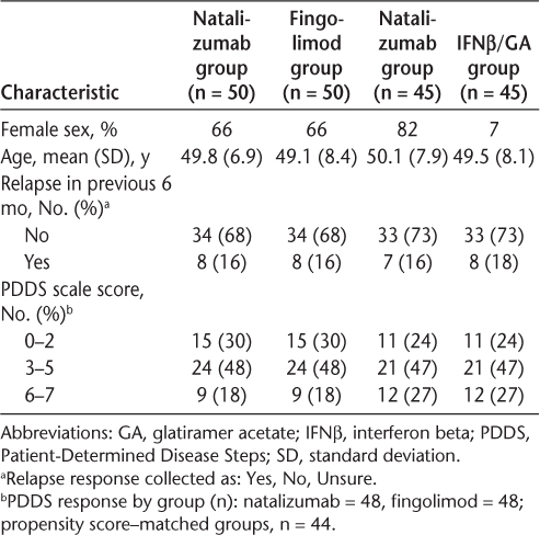All 50 participants who switched to fingolimod therapy and 45 of 71 participants who switched to IFNβ/GA therapy were successfully matched based on similarity of propensity score to participants who continued taking natalizumab. Owing to differences in PDDS scale scores and age, a higher proportion of females than males matched in the IFNβ/GA group. Baseline demographics and disease characteristics were highly similar between the matched participants (Table 2). Median (range) total follow-up time did not differ significantly between matched participants who continued taking natalizumab (48 [18–72] months) and those who switched to fingolimod therapy (54 [18–72] months) (P = .08) but was significantly lower in matched participants who continued taking natalizumab (54 [24–72] months) than in those who switched to IFNβ/GA therapy (60 [24–72] months) (P = .006).