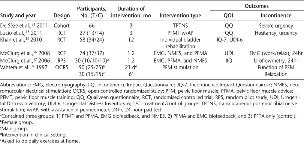 Results: Six studies met the inclusion criteria. Between-group analysis revealed statistically significant differences in incontinence episodes and QOL, but did not reach significance for functional control mechanisms (eg, electromyography data on strength of contraction, relaxation, and endurance). Incontinence leakage episodes and QOL participation improved within groups.