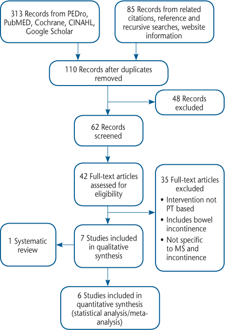 Physical therapy (PT) has proved to be effective in reducing the effects of UI in non-MS populations, but literature is scarce in MS.11,12 The purpose of this study was to review the existing literature regarding the effectiveness of PT in reducing UI and increasing quality of life (QOL) in people with MS.