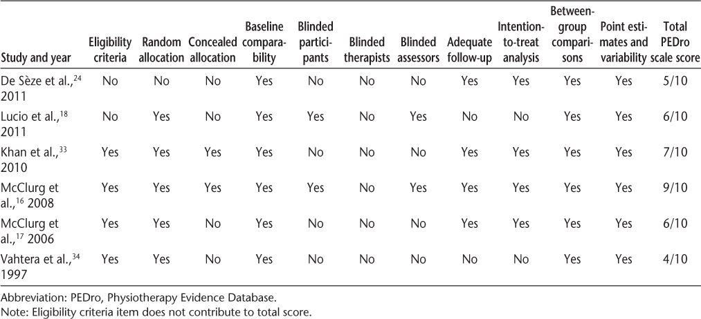PEDro scale. PEDro Physiotherapy Evidence Database website. http://www.pedro.org.au/english/downloads/pedro-scale. Accessed November 30, 2013.