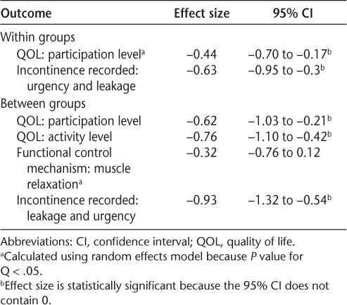 Between-group analyses for all the outcome measures are depicted in Figure 2A. Grand effect sizes were statistically significant for QOL and incontinence leakage episodes but not for functional control mechanisms (eg, EMG data on strength, relaxation, and endurance).