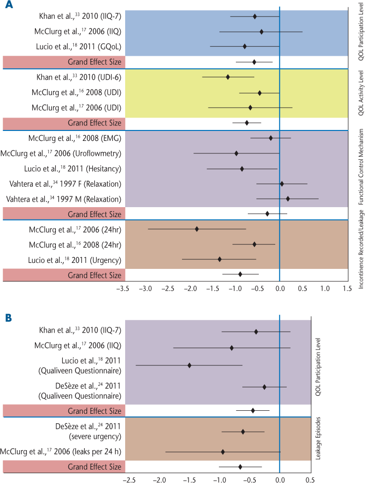 A within-group analysis of QOL participation level was performed for the studies by Khan et al.,33 McClurg et al.,17 De Sèze et al.,24 and Lucio et al.18 Analysis of incontinence recorded (urgency and leaks per 24 hours) was performed using data from De Sèze et al.24 and McClurg et al.17 Figure 2B portrays these analyses, showing the grand effect sizes to be statistically significant for both outcome measures.