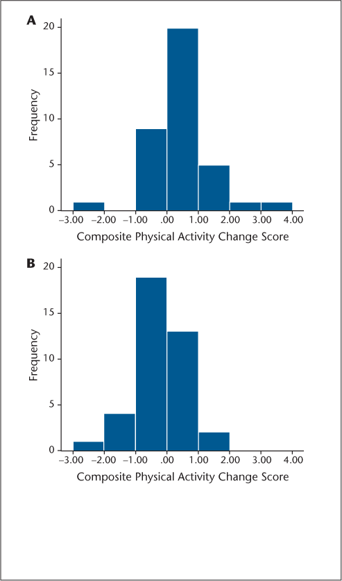 The histograms in Figure 1 indicate that there was substantial variability in the magnitude of change for participants in the intervention and waitlist control conditions. For example, 27 participants in the intervention condition demonstrated increases in physical activity (ie, a positive z score), with seven participants demonstrating large increases in physical activity (ie, a z score of ≥1 SD improvement). By comparison, ten participants in the intervention condition demonstrated decreases in physical activity (ie, a negative z score). Interestingly, 15 people in the waitlist control condition demonstrated an increase in physical activity without a behavioral intervention, whereas 24 demonstrated a reduction in physical activity. The differential distribution of change classification between groups was significant (χ2 = 10.46, P < .05).